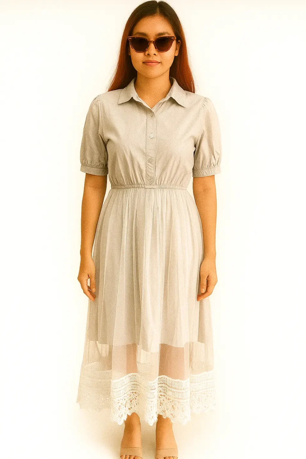 Dress Midi Abu-Abu dengan Rok Tulle dan Detail Renda