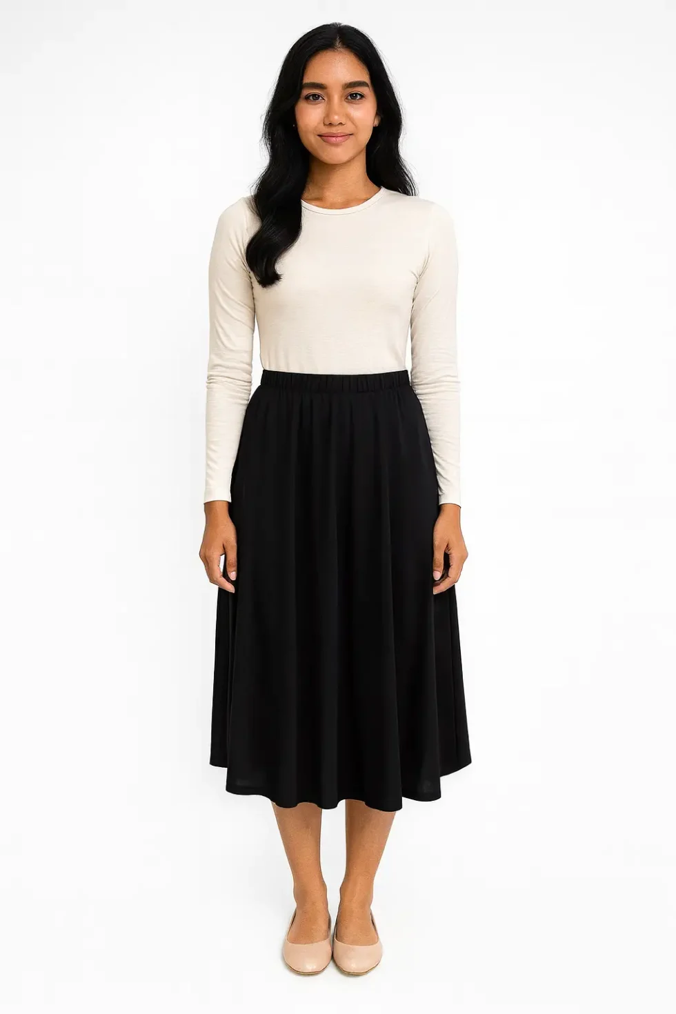 Rok A-line Midi Pinggang Karet Warna Hitam