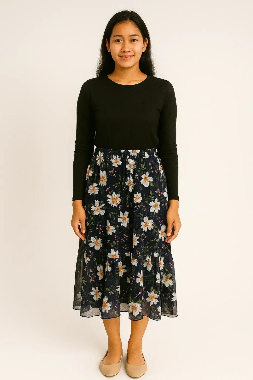 Be the first to review “Rok Chiffon Motif Bunga Daisy Navy”