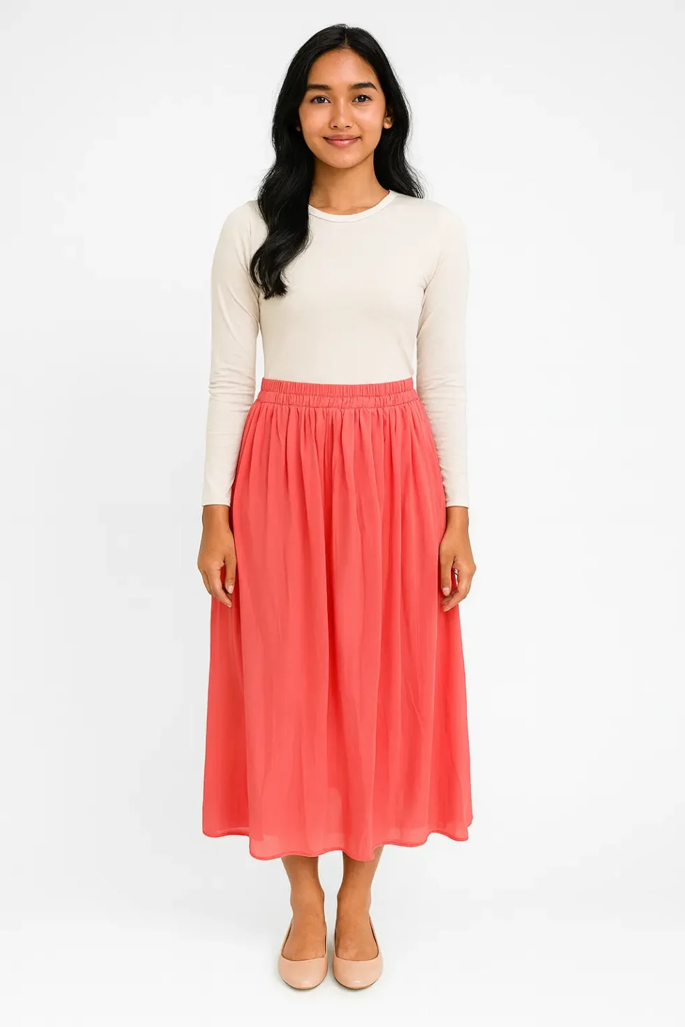 Rok Maxi Flowy Pinggang Karet Warna Coral