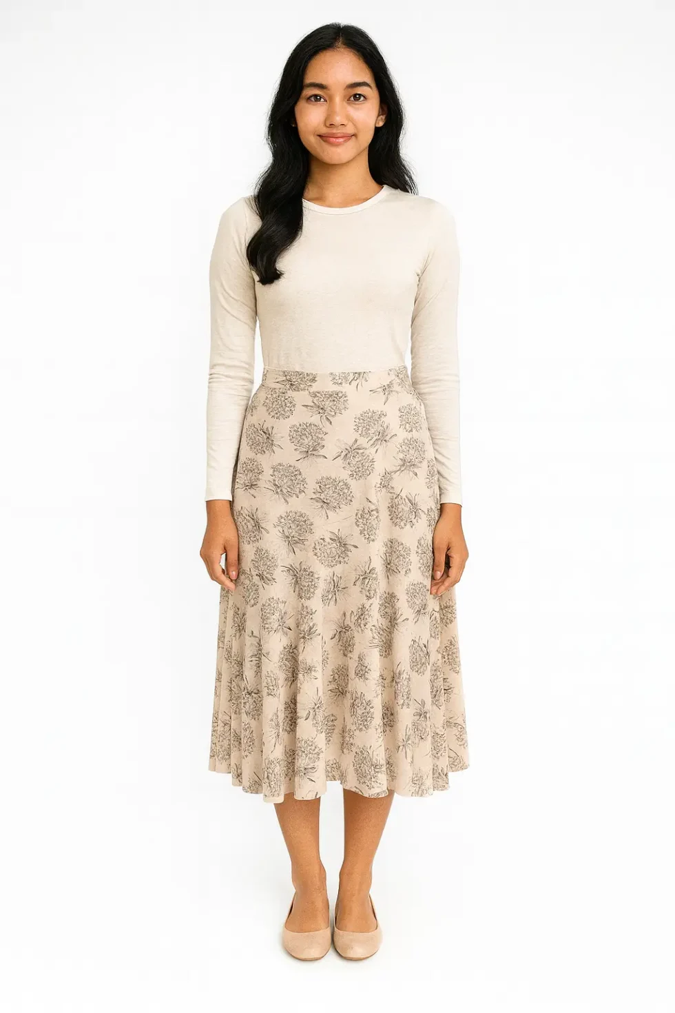 Rok Midi A-line Motif Bunga Vintage Warna Beige