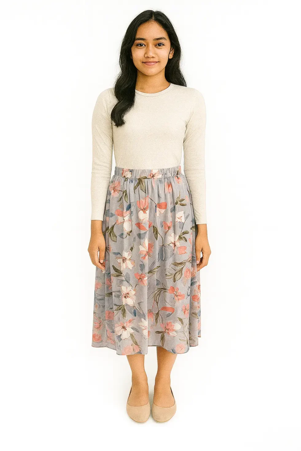 Rok Midi A-line Motif Bunga Warna Abu-abu