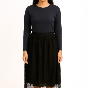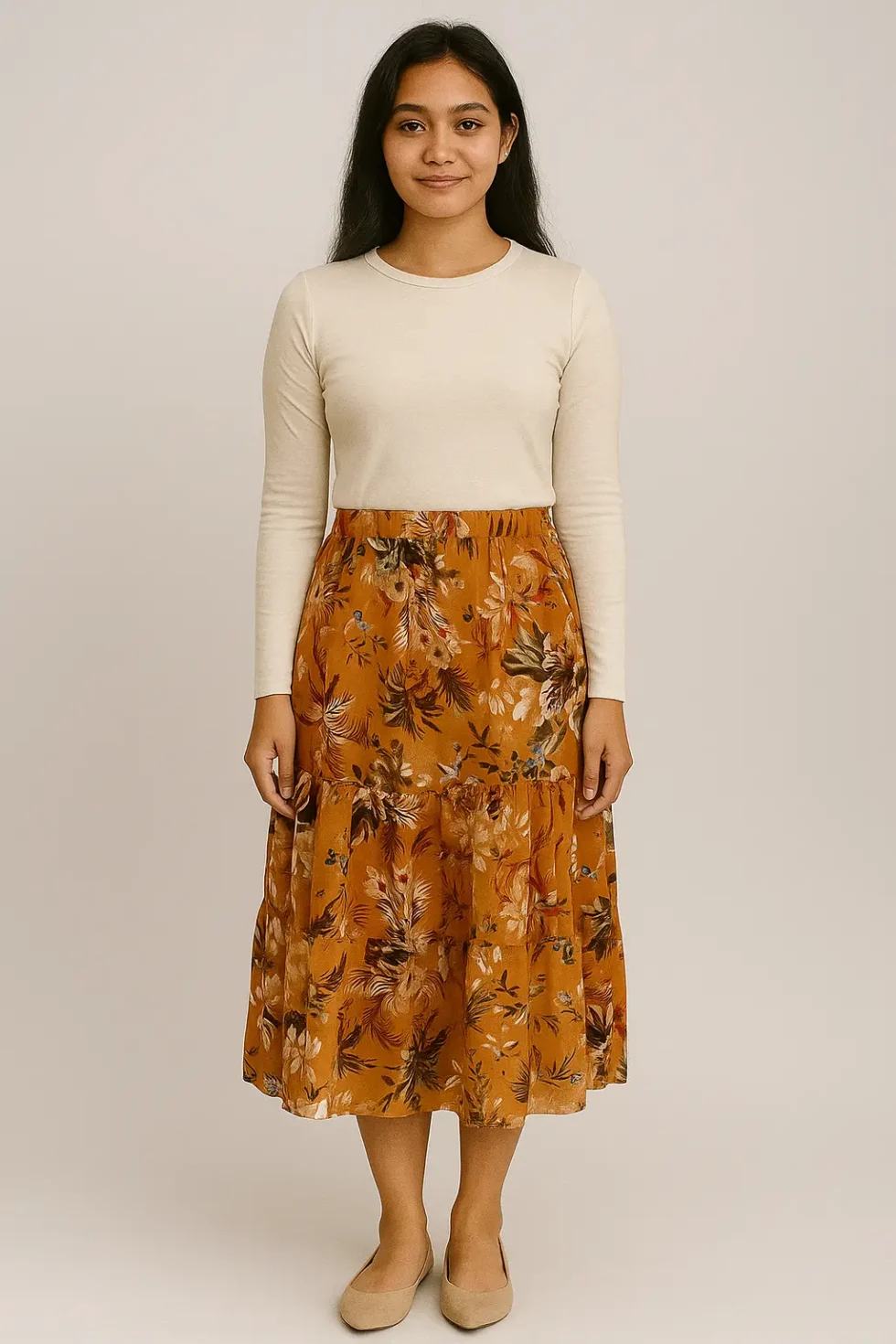 Be the first to review “Rok Midi Motif Bunga Mustard Bertingkat”