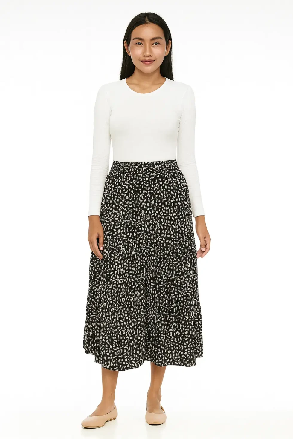 Rok Midi Tiered Motif Abstrak Hitam